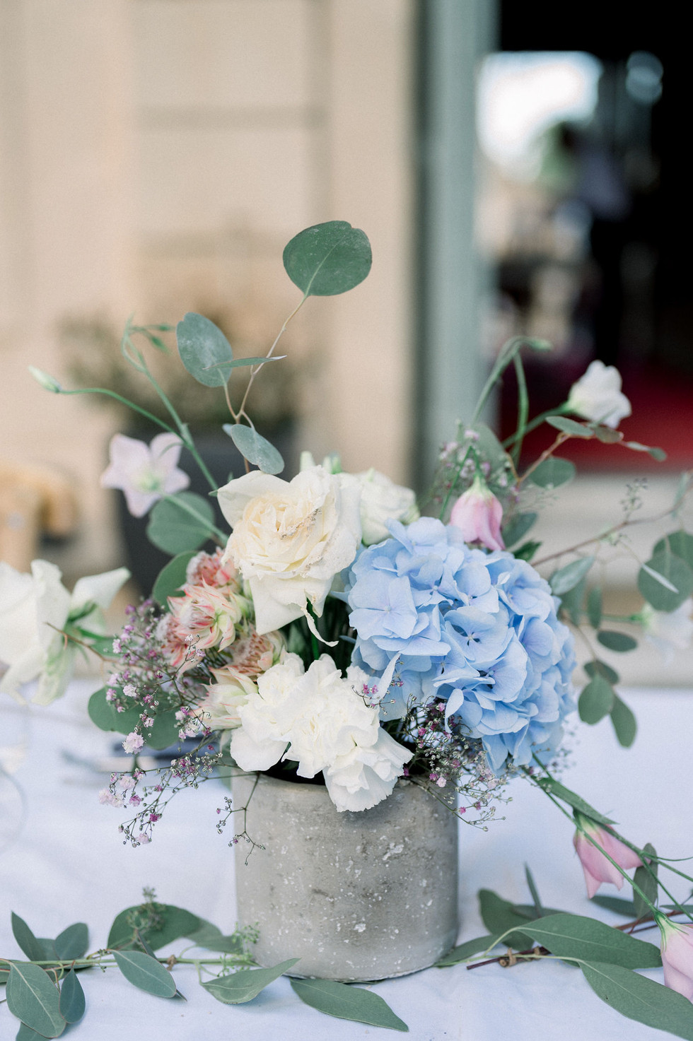 Return to simplicity and elegance for this wedding in royal colors at the Château de la Mogere. Tina absolutely wanted a touch of blue throughout the floral decoration for her big day. Perfect to highligh the predominant pastel and white of the procession at the reception.
